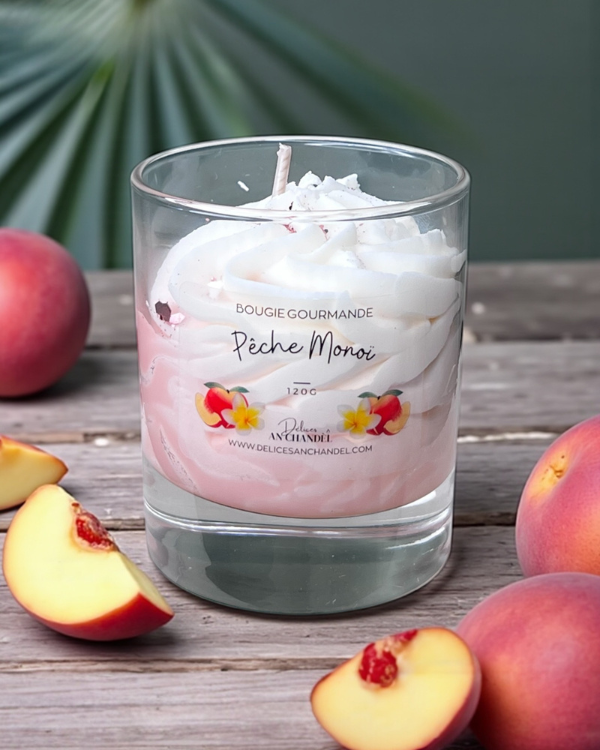 Fermez les yeux.. Vous êtes en vacances. La bougie Pêche Monoï embaume l'air d'un parfum doux, chaud et délicieusement exotique.
